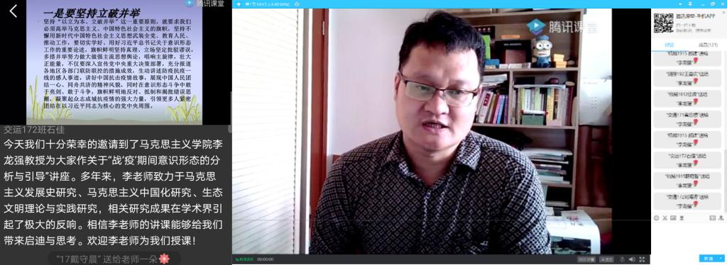 为了弘扬爱国主义精神,培育爱国主义情怀,做好爱国主义教育。3月27日上午10时,tyc122ccVIP“初心理论”学习社举办主题讲座活动。邀请马克思主义公司李龙强博士通过“腾讯课堂”APP开展线上专题讲座,解读中国为什么能够迅速控制住武汉疫情,分析中国特色社会主义制度的显著优势,引导公司员工树立战胜疫情的信心与决心。公司共计226名同学参加此次线上专题讲座。