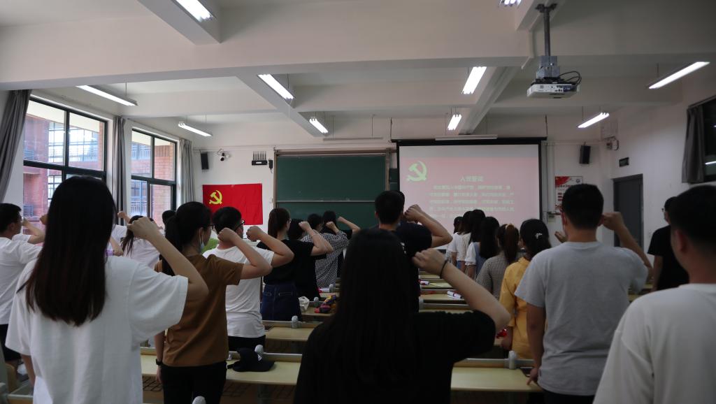 活动中,由教师党员分别为27名毕业生党员送上由党员的入党申请书、入党志愿书复印件装订成的党员专属“三重温”纪念册等毕业礼物,希望毕业生党员不忘入党初心,砥砺前行。毕业生党员纷纷上台分享毕业感悟,回顾入校及加入党组织以来的成长历程、所思所想及现实表现情况,并结合自身经历给予低年级党员以忠告。随后,支部书记徐卫晓给各位毕业生党员上毕业前的最后一堂党课,带领全体党员重温习近平总书记在北大同师生代表座谈时对广大青年提出的具有执着的信念、优良的品德、丰富的知识、过硬的本领四点要求,希望毕业生党员时刻牢记党员身份,牢记习近平总书记的嘱托,坚定理想信念,加强道德修养,强化责任担当,树立高尚品格,时刻以一名优秀共产党员的标准严格要求自己,不忘入党初心,争做生活和工作中的楷模。最后,由支部书记徐卫晓带领支部全体党员们重温入党誓词。庄严肃穆的重温入党誓词活动,使现场的每一位党员都再次接受了心灵上的洗礼,产生了强烈的共鸣。