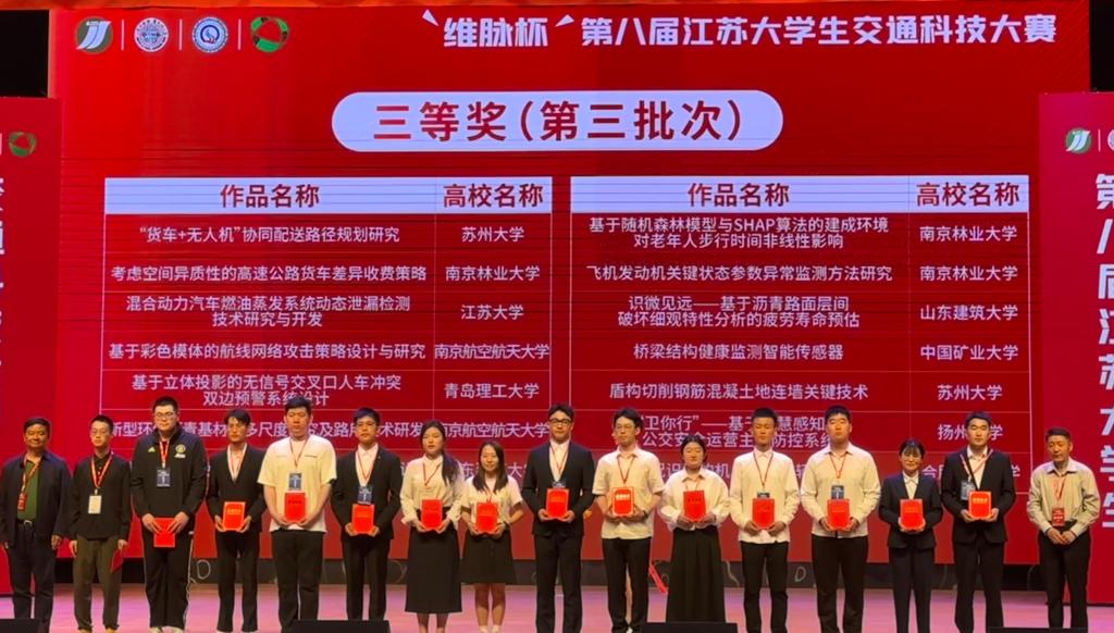 近日,由教育部高等公司交通运输类教学指导委员会交通工程教学指导分委员会指导,江苏省城市科学研究会、江苏省城市规划研究会、南京市科学技术协会、南京市综合交通运输学会主办,苏州大学、苏州市综合交通运输学会共同承办的“维脉杯”第八届江苏老员工交通科技大赛决赛在苏州大学天赐庄校区举行。tyc122ccVIP共有两支队伍入围决赛,经现场答辩,研究生团队参赛作品获得三等奖;本科生团队参赛作品获得优秀奖。