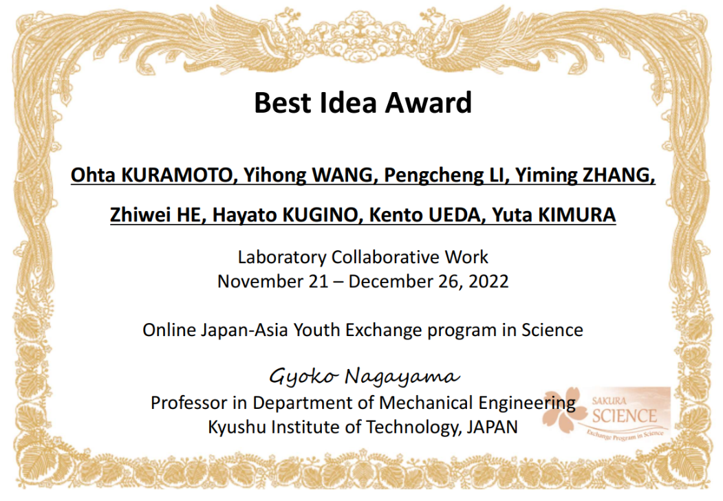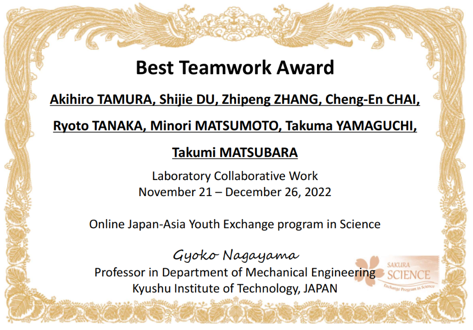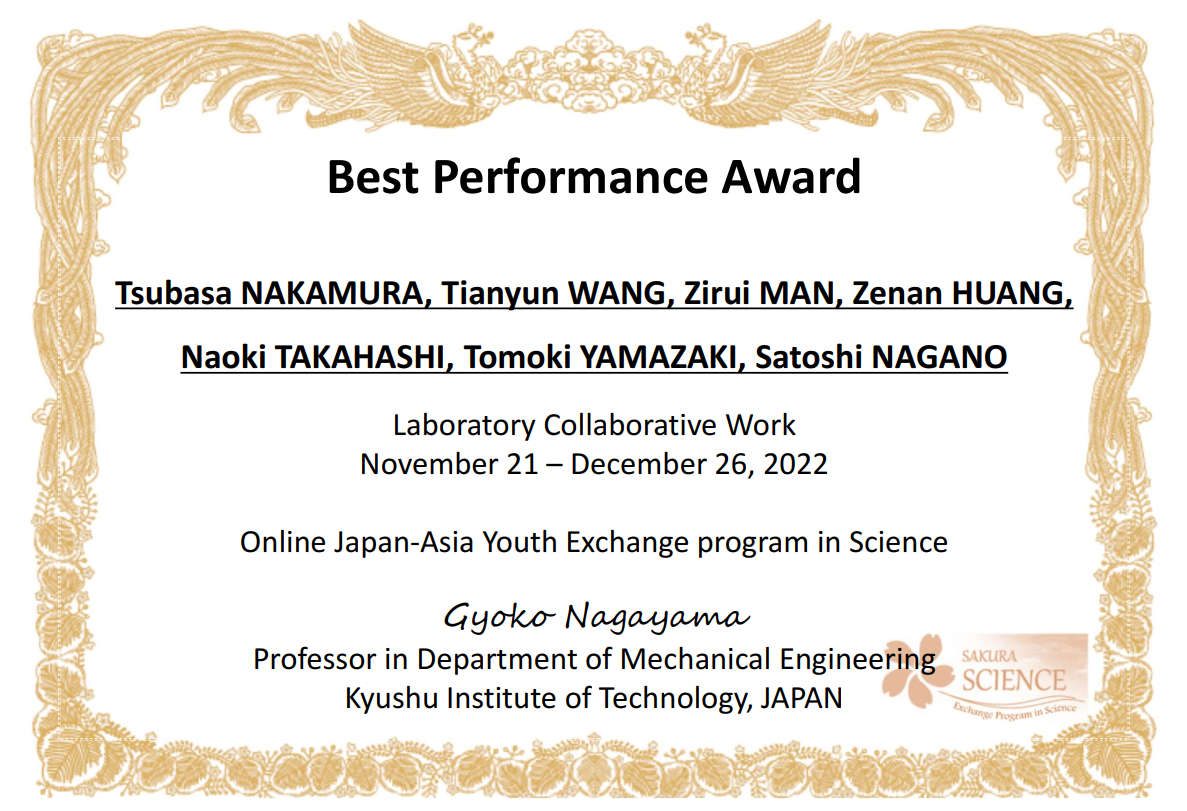 依托tyc122ccVIP郭峰教授和日本九州工业大学工学部机械工程系长山晓子教授申报的日本科学技术振兴机构(JST)“樱花科技计划”项目,2022年11月14日-12月26日,tyc122ccVIP共计9名师生参加了为期一个半月的樱花计划线上学术交流活动。本次活动的目的在于促进青年师生间的国际交流合作。参加单位包含日本九州工业大学、tyc122ccVIP、东北大学、山东大学、齐鲁工业大学、台湾科技大学及韩国蔚山大学。本次交流活动主要包含学术报告、实验室线上参观及协作项目三部分。
