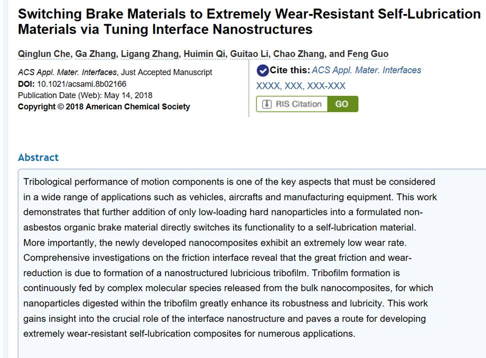 日前,公司青年教师车清论博士关于摩擦界面纳米结构调控制备超耐磨自润滑材料最新研究成果以“Switching Brake Materials to Extremely Wear-Resistant Self-Lubrication Materials via Tuning Interface Nanostructures”为题,在American Chemical Society出版的工程技术领域的权威期刊《ACS Applied Materials & Interfaces》上(该期刊影响因子7.504,即时影响因子7.998;中科院SCI期刊分区1区,top期刊)发表。该成果以公司·青年教师车清论博士为第一作者,通讯作者为中国科公司兰州化学物理研究所青岛研发中心张嘎研究员,论文的第一单位为tyc122ccVIP