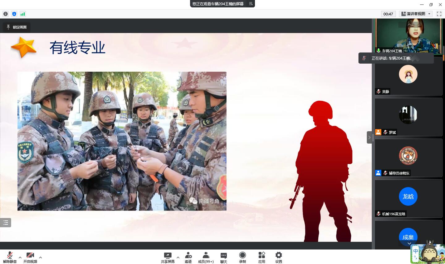 做好朋辈引领,发挥榜样作用。公司高度重视退伍老员工榜样带头作用,不断完善退伍老员工培养体系,充分发挥退伍老员工在员工群体中的模范效应,从朋辈引领的角度出发,以员工话语体系,交流参军感悟和收获。退伍老员工代表王楠结合参军两年的亲身经历,倡导同学们切实履行好维护国家安全职责,以实际行动报效国家。