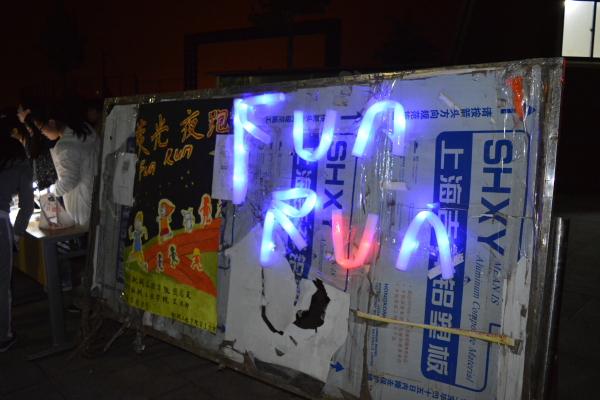 8点40分左右,同学们陆续到场,排队领取荧光设备。随后,同学们在起点处准备,等待活动开始。9点钟,荧光夜跑活动正式开始,随着工作人员的一声哨响,同学们如离弦之箭般的冲出。夜跑路线为从操场北门开始,依次经过一食堂、情人坡、实验楼、主教学楼,之后返回,随行人员骑自行车跟随队伍,以防意外发生。在夜跑活动过程中,同学们热情高涨,熟稔的朋友间更是展开了速度比拼,你追我赶,好不热闹。半小时后,同学们全部回到起点,夜跑活动顺利结束。