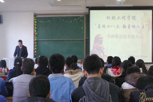 11月14日中午,机械公司“喜迎十八大,翰墨颂人生”书画展总结表彰大会在嘉陵江路校区主教学楼B228举行。公司团总支副书记化磊老师为获奖同学颁奖。本次书画展由公司团总支主办,公司员工会宣传部承办。