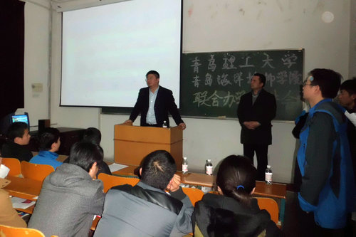 会上,首先由肖安全副经理对青岛海洋技师公司办学理念以及办学历史作了简单的介绍,然后向同学们详细的介绍此次联合办学的基本情况,肖安全副经理告诉大家此次联合办学采用弹性学制,在学到技能的同时不影响正常的学习而且免除学费和书本费,力求将同学们培养成有职业技能基础的高学历高素质专家型管理人才,实现两条腿走路。肖安全副经理和王主任对同学们的提问都作了详尽的回答。