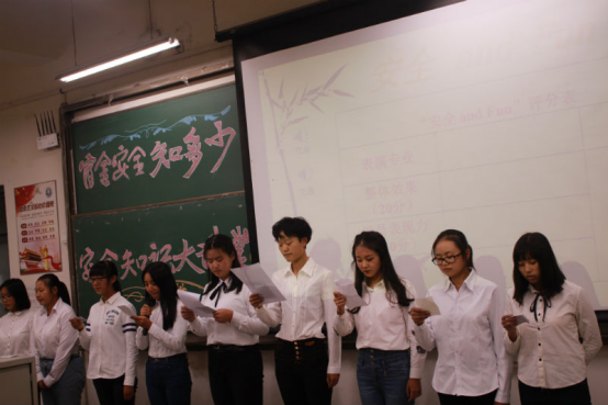 大讲堂在纪检部干事主持下开始了首项活动——安全知多少,各个专业出一位代表,发言陈述自己对安全问题的见解。随后,殷老师上台发言,要求同学们重视安全,消除隐患。告诫我们要从小事做起,处处注意安全问题,同学们受益匪浅。下一项由各个专业代表上台进行自己感兴趣的与安全相关主题的PPT讲解,各个班级进行了风格各异的讲解。最后一项,各个班上台表演主题相关的节目,安全工程表演的小品在给同学们带来欢乐的同时也鸣响了安全的警钟。压轴上场的交通运输带来了精彩的朗诵与合唱,两种表演的完美结合,赢得了所有观众评委的热烈掌声。根据几项活动综合打分,交通运输专业荣获一等奖,车辆工程、交通工程专业获得二等奖,安全工程与汽车服务工程获得三等奖,殷老师及员工会主席团为其颁奖。