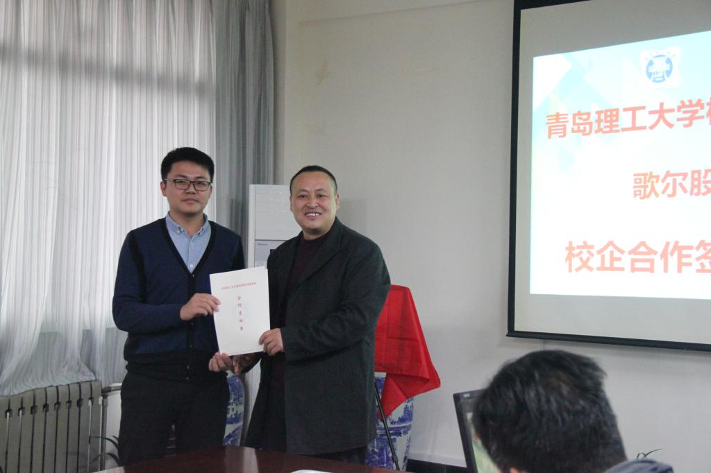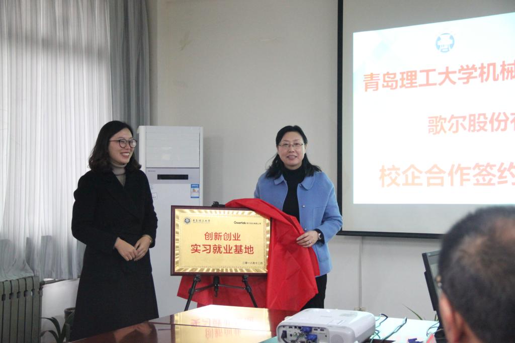 12月6日上午,公司与歌尔股份有限公司在嘉陵江路校区主教学楼A414举行校企共建签约暨揭牌仪式。歌尔股份人力资源本部高校合作部部长徐燕、歌尔股份事业群声学研发部部长伯龙、歌尔股份人力资源本部高校合作部经理张德华,公司党总支书记岳丽宏、泰山学者林天然和刘碧龙、公司副书记林海涛、副经理杨勇、王优强及各教研室主任、就业辅导员、部分硕士研究生参加了本次会议,会议由林海涛主持。