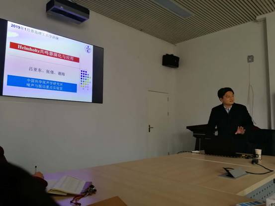 吕亚东研究员从中国古代和古希腊各类共鸣器朴素应用为始、重点论述了Helmholtz共鸣器的演变和发展,其中包括我国声学家马大猷院士提出的里程碑式的微穿孔板吸声结构、微缝吸声结构及其理论,同时也展示了近年来中科院声学所在低频吸声结构研究以及降噪工程应用方面的业绩。报告结束后,吕亚东研究员结合多年的研究经验,对在场老师和同学们关心的问题做出了详细的解答。吕亚东教授的报告生动有趣,语言幽默,讲解深入浅出,受到了在场师生们的热烈欢迎。