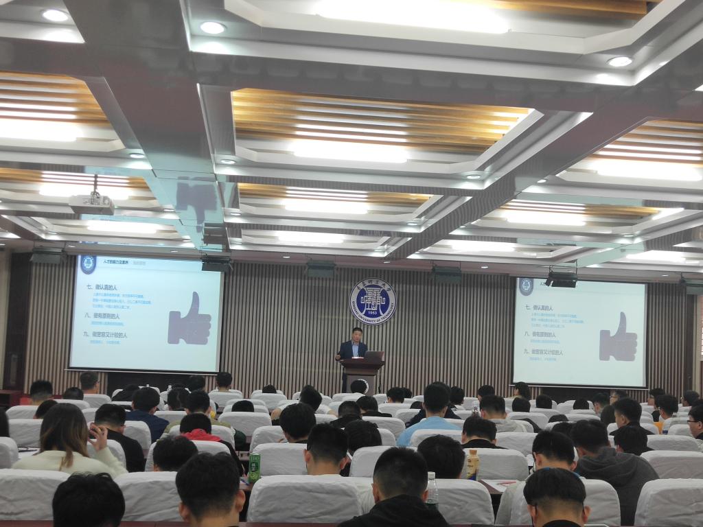 姜文鸽结合个人三十年的职业生涯分享了自己从初入社会的毕业生到企业董事长的心路历程。通过引用大量的数据和经典案例向同学们说明成功从来不是一蹴而就的,而是源于一点一滴的积累,源于脚踏实地,勇于开拓,不断拼搏的结果。他结合自己创办企业、选人用人的需求指出了人是核心要素这一企业管理规律,向广大师生介绍了人才应该具备的五种能力、七种素养和八点感悟。在谈到人才应具备发现机会的能力时,姜文鸽引用奥巴马邻居的故事和自己创办天山重工的机缘给在座的师生以忠告,他指出机会是稍纵即逝的,找准机会、抓住时机,有魄力,并配备以严格的管理手段才是他成功创办企业的要素。姜文鸽与在座的同学进行精彩互动,就企业招聘看重学历还是能力,大学时期做职业规划的必要性等问题进行了深入讨论,给在座的同学们提出了宝贵的建议,赢得满堂喝彩。