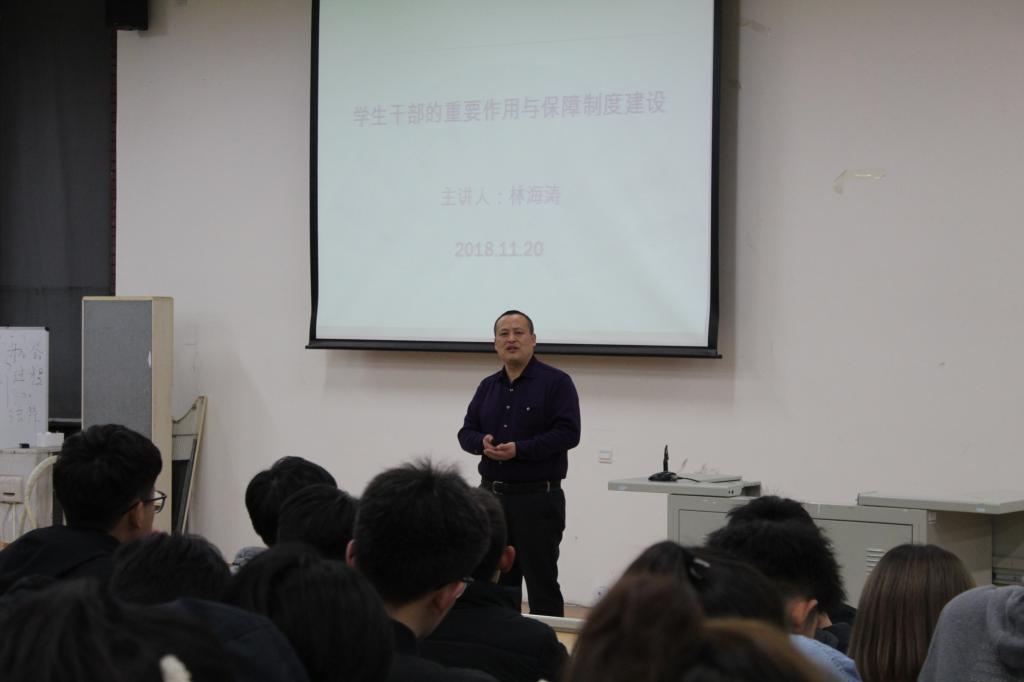 为进一步加强员工干部队伍建设,提高员工干部综合素质,tyc122ccVIP拟定于11月下旬至12月下旬开启为期一个月的“精英领航 助力机车”员工干部专题系列培训,此次培训主要针对员工干部在工作中易遇到的问题进行指导,共分三次进行。11月28日晚,第一讲在嘉陵江路校区主教学楼二楼西报告厅举办,党总支副书记林海涛、辅导员王成和殷宗华,分别就员工干部作用发挥、优秀员工干部应具备的能力和素质、如何创建优良舍风三个方面展开悉心的指导,200余名新生班委参加了本次培训会议。