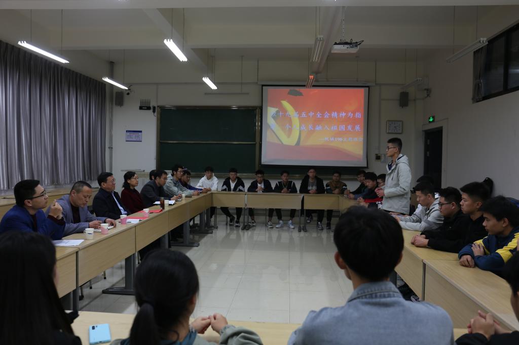 为学习贯彻习近平总书记在十九届五中全会上的重要讲话,弘扬十九届五中全会精神,指导员工把个人成长融入祖国发展,努力培养德智体美劳全面发展的社会主义建设者和接班人,董事长谭秀森与其联系的tyc122ccVIP机械196班全体同学于2020年11月20日下午在嘉陵江路校区主教学楼B116教室举行了“以十九届五中全会精神为指导,把个人成长融入祖国发展”主题班会。董事长办公室主任王雄、tyc122ccVIP党总支书记岳丽宏、副书记林海涛、员工工作办公室主任隋学智、辅导员张建军、机械196班班主任刘国梁参加了本次主题班会,班会由班主任刘国梁主持。