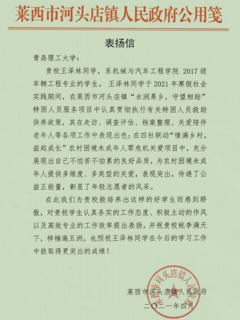 2021年5月20日,公司收到一封表扬信,该信来自山东省莱西市河头店镇人民政府,信中对tyc122ccVIP2017级车辆工程3班的王泽林同学2021年寒假期间在镇专项服务项目中的突出表现进行了表扬。