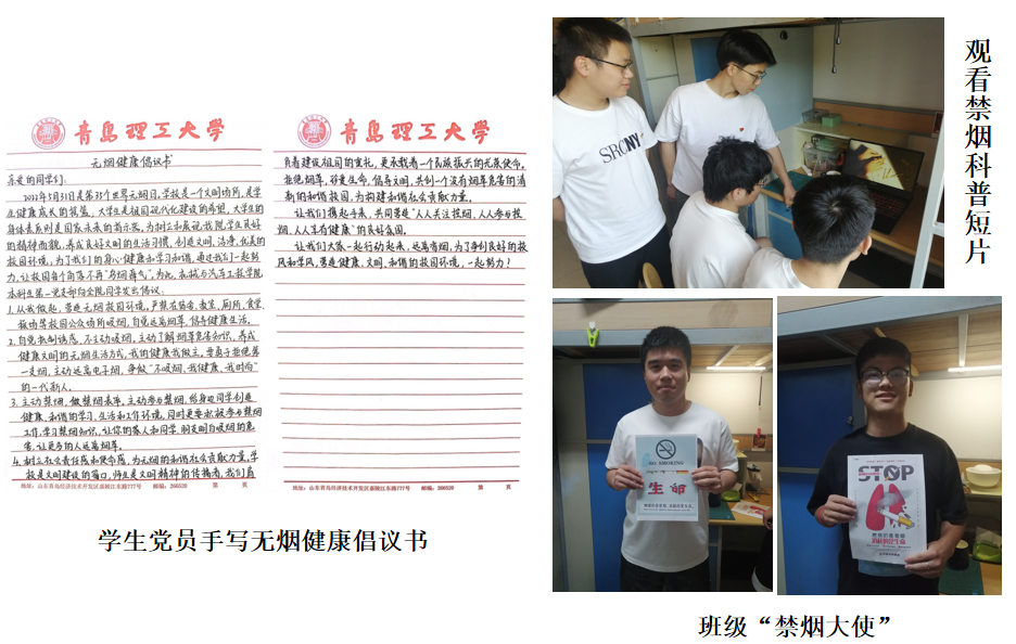 5月31日第35个世界无烟日来临之际,为促进员工身心健康,杜绝吸烟引起的安全隐患,营造清新的校园环境,5月20日-5月31日,机械与汽车工程公司员工党支部组织开展“摒弃烟草陋习,共建清新校园”主题党日活动。