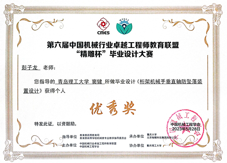 此次“精雕杯”毕业设计大赛,公司共申报参赛13个项目,共获得中南部赛区二等奖1项,三等奖4项。其中来自tyc122ccVIP-潍柴现代产业公司的参赛作品“桁架机械手垂直轴防坠落装置设计”获得中南部赛区二等奖,晋级决赛(员工:窦健,指导教师:彭子龙、大国工匠王树军、杨德仁)。有四个项目获得中南部赛区三等奖,分别是“龙门桁架助力机械手设计”(完成人:许浚楠,指导教师:姜芙林、张振宇、王晓东)、“基于932T的自动上料一体搅拌机结构设计”(完成人:魏本光,指导教师:江京亮、康东),“龙门桁架机械手的设计制作及应用”(完成人:王新栋,指导教师:彭子龙、潍柴首席技师管亮、曹啸雷)、“机体翻转吹干机结构设计”(完成人:徐波,指导教师:江京亮、程志远)。