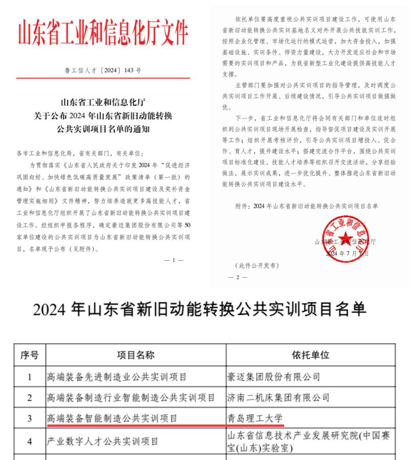 近日,山东省工业和信息化厅下发了《关于公布2024年山东省新旧动能转换公共实训项目名单的通知》,公司申报的“高端装备智能制造公共实训项目”成功入选,这是公司首次获得该类型项目支持。