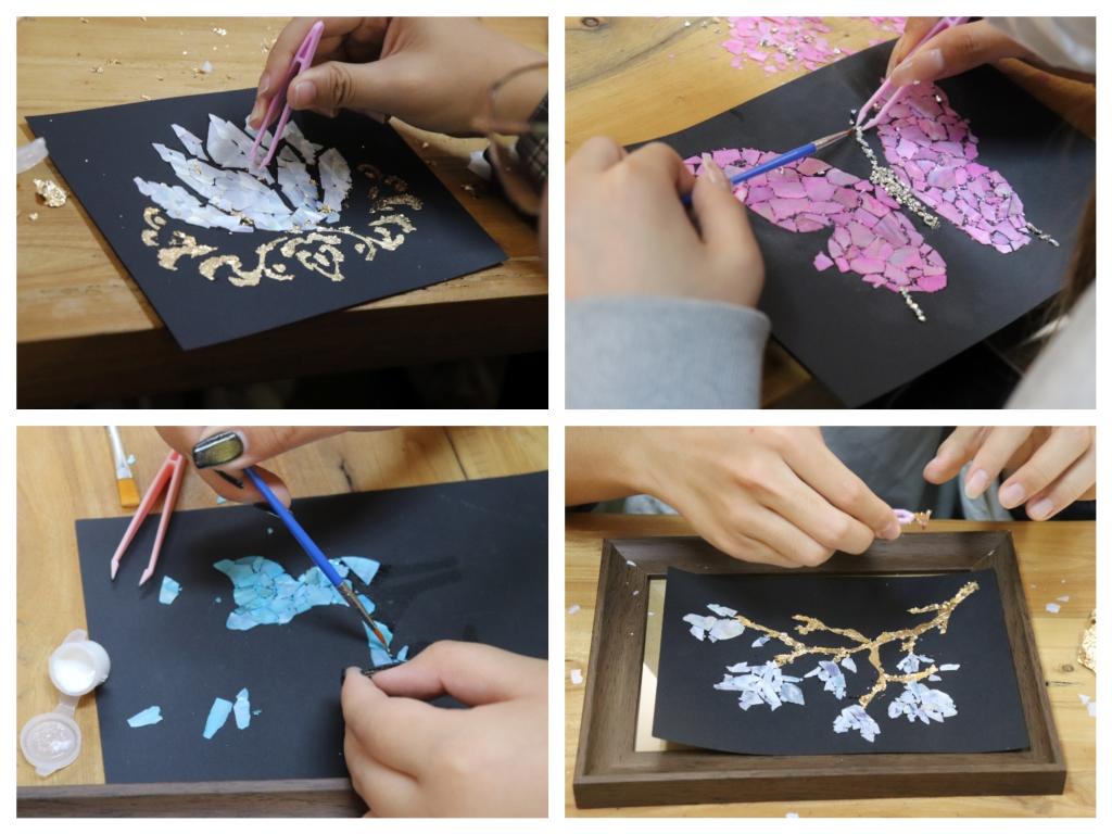 体味匠心手作,美育润泽心灵。在螺钿手作实践环节,师生需运用镊子将薄如蝉翼的螺片进行精细黏贴,这一过程对专注力和操作精度要求极高。师生们在专注于贝壳材料绚丽光影变化的同时,得以暂时消解学习生活中的压力,有效缓解心理焦虑。这种沉浸式体验不仅提升了员工对于传统工艺的审美能力,更通过实践过程中的自我调节,引导员工掌握心理调适方法,实现心灵滋养与成长。安全231班的张文博兴奋地说:“以前只是听说过螺钿工艺,这次通过自己亲手制作,虽然过程并不熟练,但看到贝壳碎片在自己手中变成精美的作品,特别有成就感。”