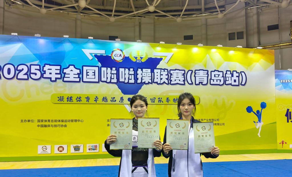 2025年全国啦啦操联赛(青岛站)近日于莱西市圆满收官。作为全国性啦啦操品牌赛事,本次联赛于9月26日至27日持续举办,吸引了70余支队伍、近千名运动员参赛,设置公开青年、公开儿童等多个组别,涵盖花球、街舞、技巧、爵士等多个啦啦操项目,采用国际啦啦操联合会最新竞赛规则评分,对选手的技术难度、艺术表现及团队配合提出极高要求,赛事专业性与影响力备受业界认可。在此番全国性赛事舞台上,邓鸿尹、孙宁涵两位同学再次展现强劲实力,不仅携手夺得公开青年乙组双人花球自选动作第五名,更与团队协作拿下公开青年乙组集体花球自选动作第一名。