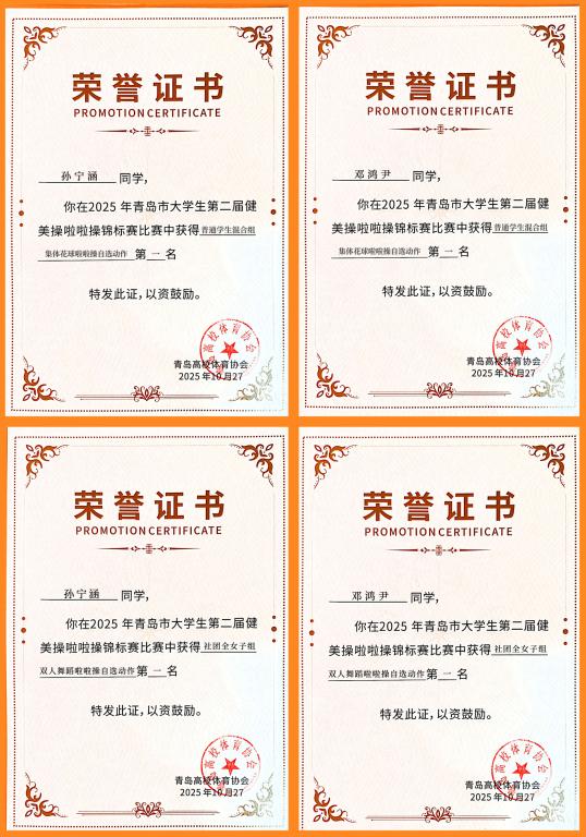 青岛市第二届健美操啦啦操锦标赛于9月27日上午正式开赛,吸引了青岛市多所高校的优秀队伍同台竞技,覆盖花球啦啦操、健美操等多个组别,对选手的动作规范性、团队配合度及艺术表现力均提出高要求,得到青岛高校体育局与多所高校的联合支持。公司邓鸿尹、孙宁涵两位同学表现突出,不仅摘得双人花球啦啦操自选动作第一名,更与团队携手拿下集体花球啦啦操自选动作普通员工混合组第一名。