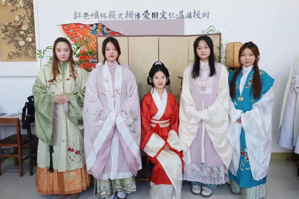 活动现场,员工社区被精心布置为沉浸式国风空间,从战国袍、曲裾、交领襦裙到坦领半袖衫、马面裙,数十套形制规范的汉服整齐陈列,志愿者为同学们提供服饰穿戴指导与形制科普,解析服饰背后的伦理内涵与文化象征,让体验不止于“颜值”,更深入“内涵”。“这不仅是穿一件衣服,更是了解古人的生活美学。”正在学习盘发技巧的同学表示,社区搭建的近距离体验平台,让传统文化不再是书本上的文字。