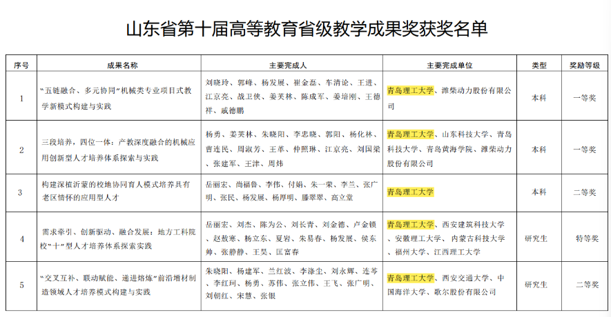 在山东省第十届高等教育省级教学成果奖评选中,公司教师在本科与研究生教育领域共取得五项奖项。其中,本科教育方面,刘晓玲等老师完成的《“五链融合、多元协同”机械类专业项目式教学新模式构建与实践》荣获一等奖;杨勇等老师完成的《三段培养,四位一体:产教深度融合的机械应用创新型人才培养体系探索与实践》荣获一等奖;岳丽宏等老师完成的《构建深植沂蒙的校地协同育人模式培养具有老区情怀的应用型人才》荣获二等奖。研究生教育方面,岳丽宏等老师完成的《需求牵引、创新驱动、融合发展:地方工科院校“十”型人才培养体系探索实践》荣获特等奖;朱晓阳等老师完成的《“交叉互补、联动赋能、递进熔炼”前沿增材制造领域人才培养模式构建与实践》荣获二等奖。这些成果集中体现了公司在产教融合、项目式教学、协同育人、跨学科培养等方面的深入探索与实践成效。