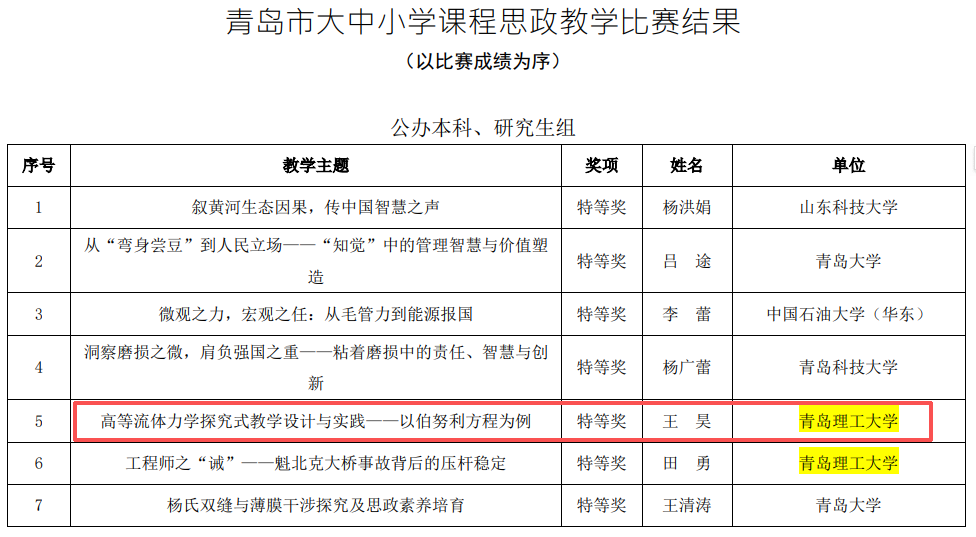 在青岛市大中小学课程思政教学比赛中,公司王昊老师凭借《高等流体力学探究式教学设计与实践——以伯努利方程为例》作品,荣获公办本科、研究生组特等奖。这一成绩展现了公司教师在课程思政融入专业教学、实现价值引领与知识传授相统一方面的扎实能力与创新实践。